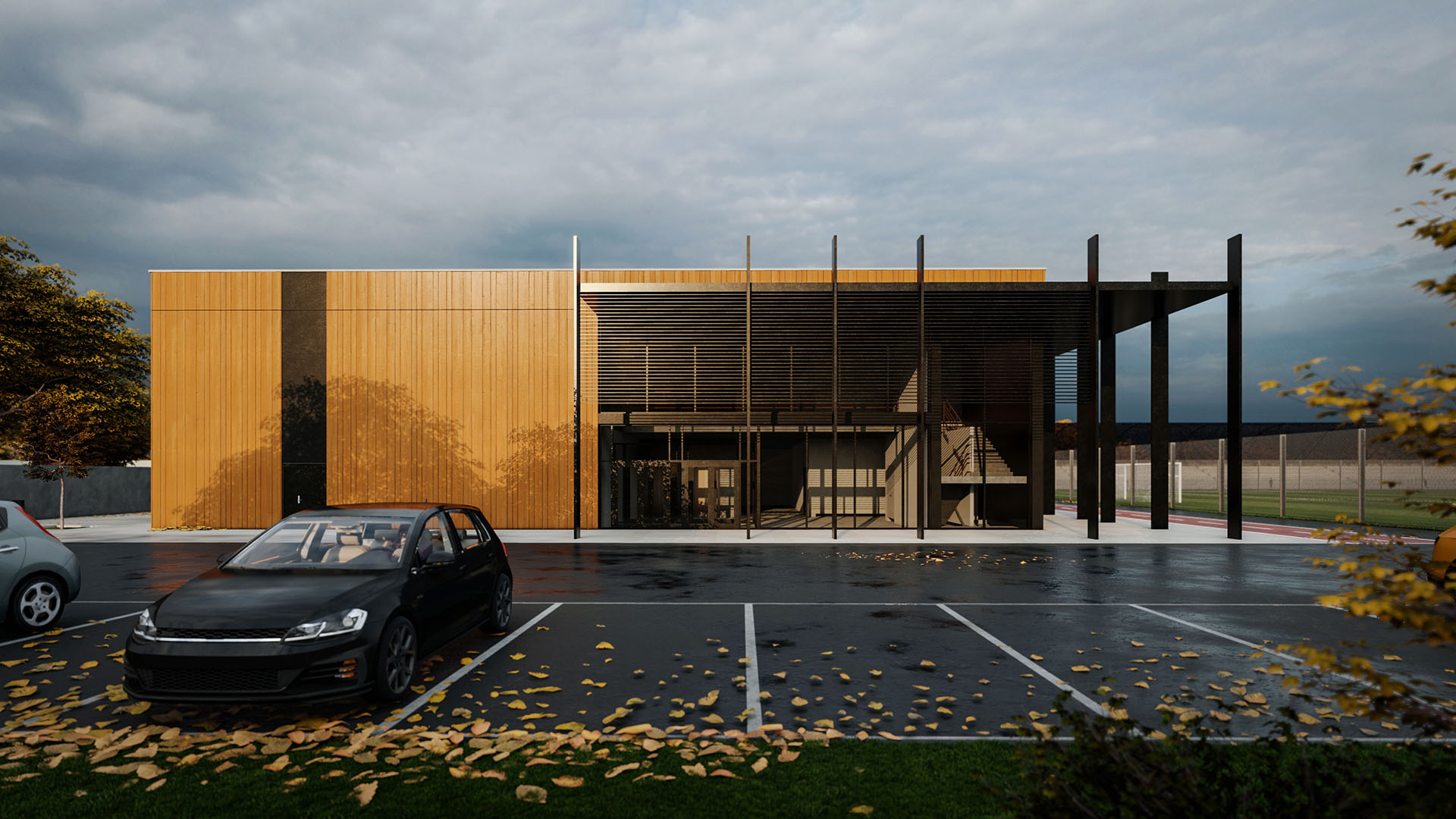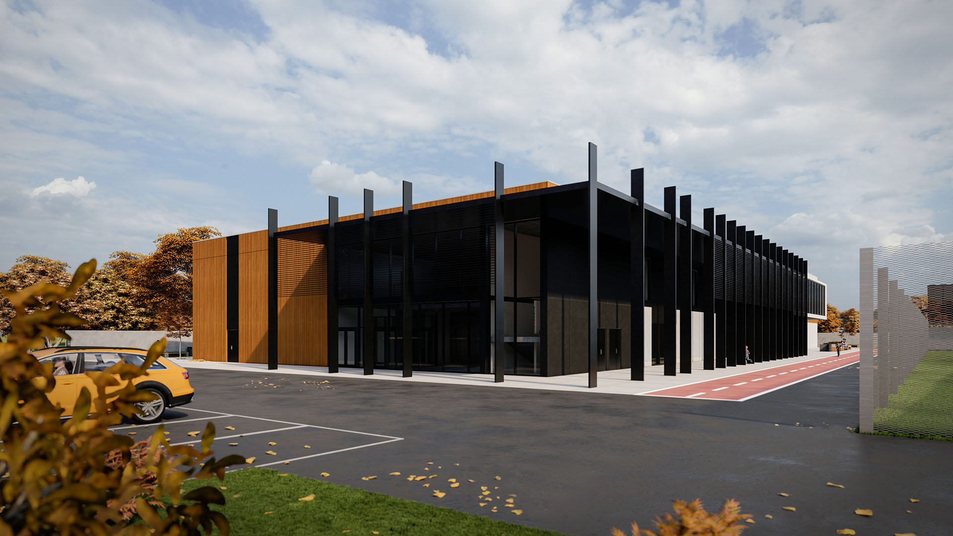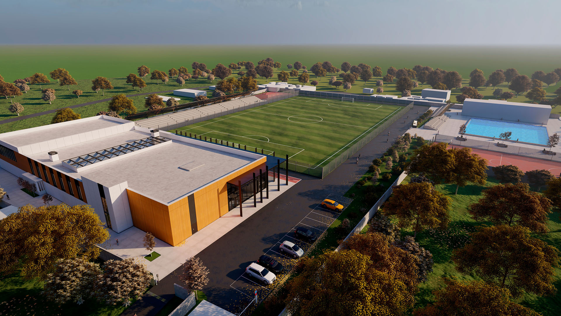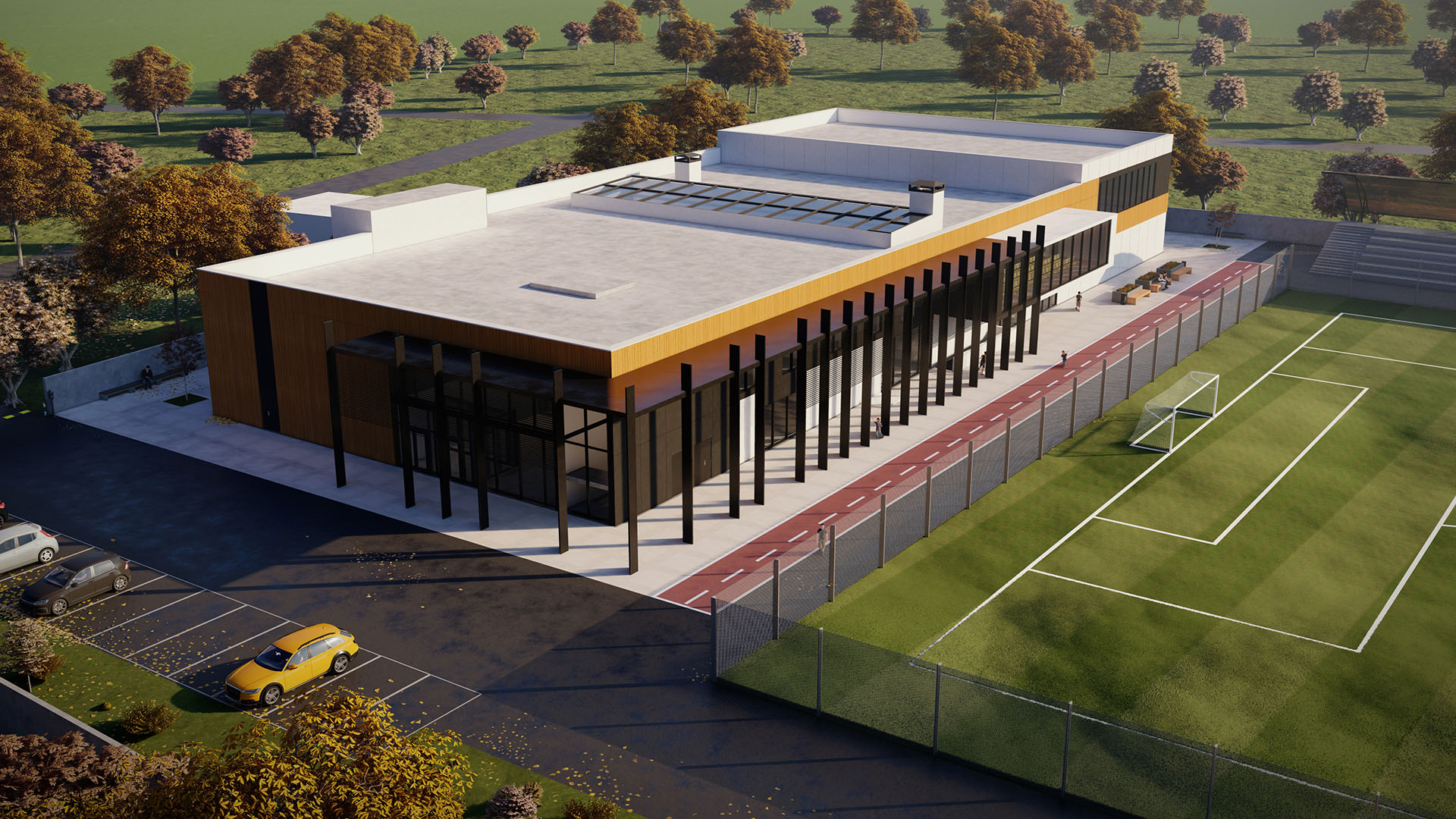 The main VIP grandstand will be positioned on the 2nd floor of the new building. There will be a parking area near the school with 14 places. A security building stands at the entrance to the parking lot, and directly behind it is an underground tunnel that serves as an emergency exit from the shelter.