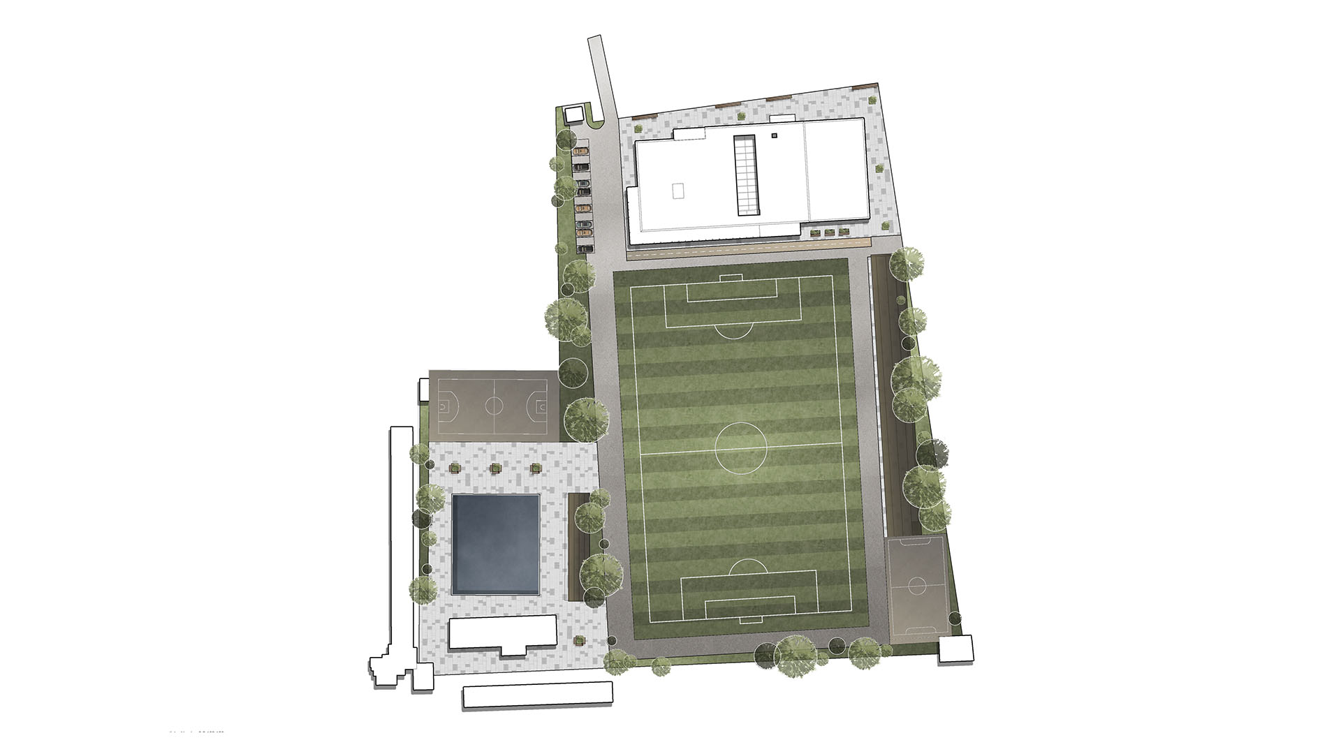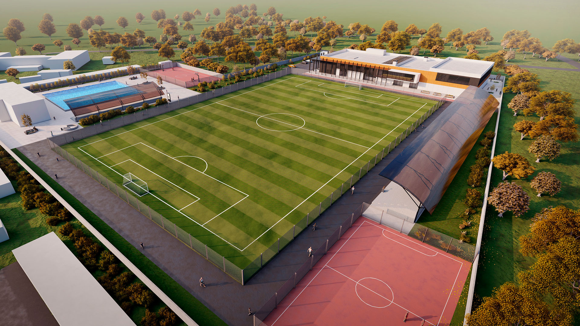 There will be three sports fields on the school grounds: basketball, volleyball and football. At the same time, the project provides spectator stands on both sides of the football field.
