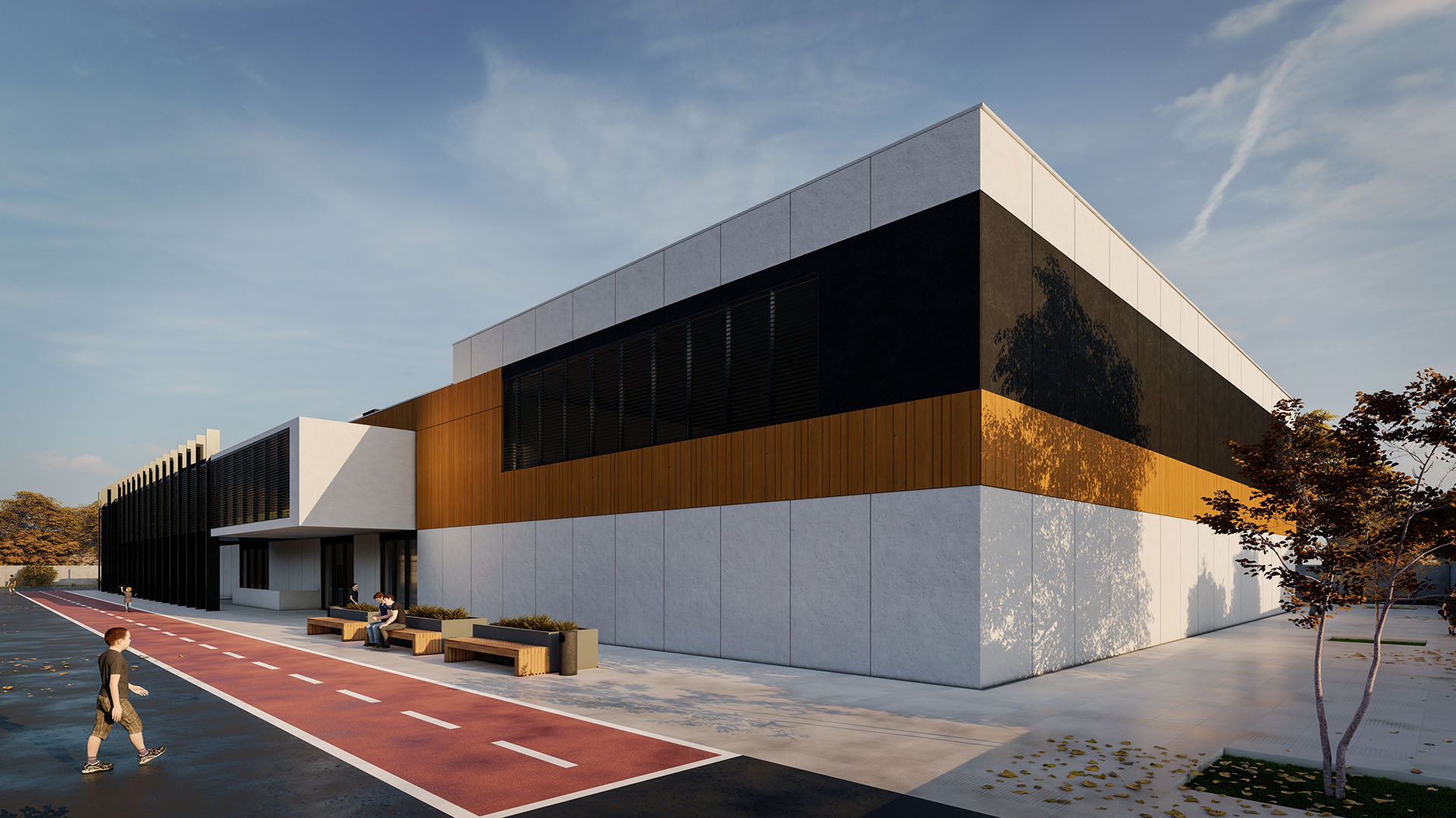 From the outside, the school building appears to be a laconic rectangular form with varied planes accentuated by textured ribs or stylized functional grilles. Materials used include visual imitations of wood, micro-concrete made from HPL panels, and metal pieces.