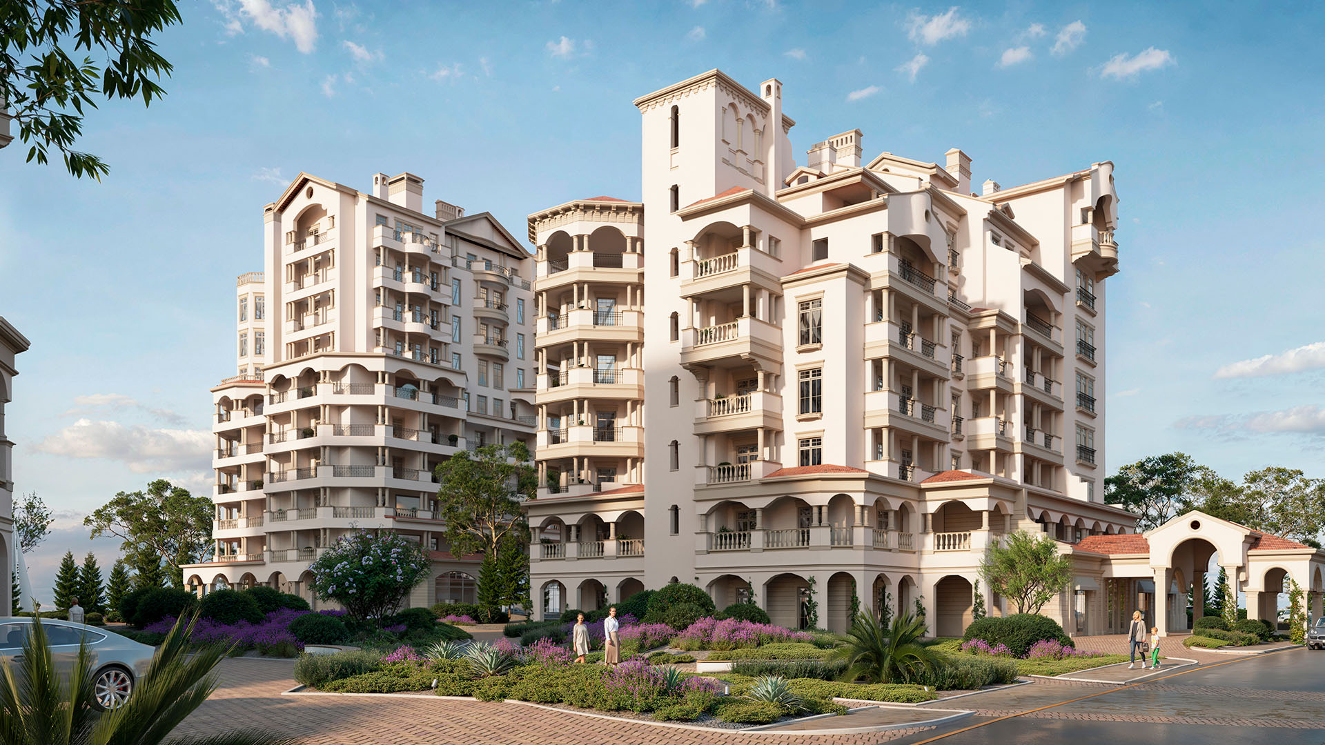 The complex includes apartments from 5 to 12 stories high, three swimming pools, recreation areas, and parking spaces, offering everything needed for comfortable and prestigious living.
