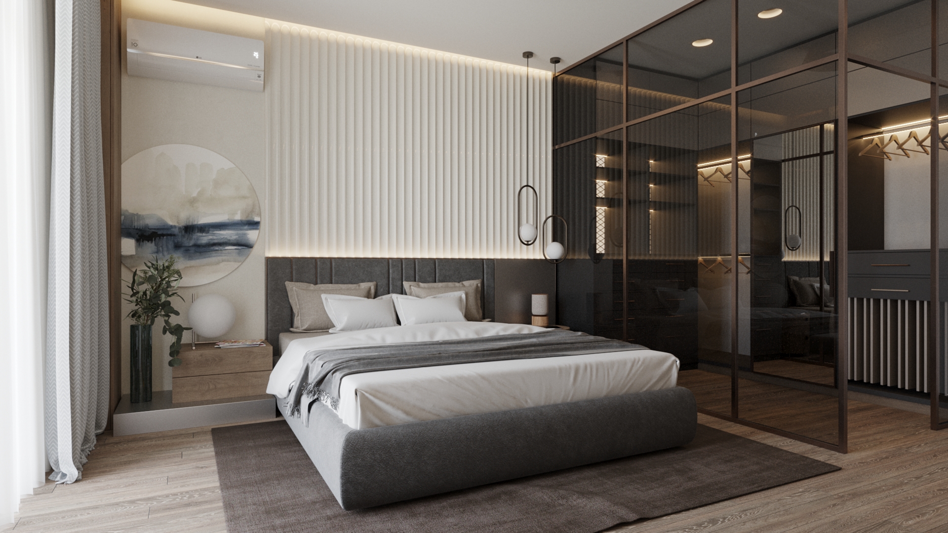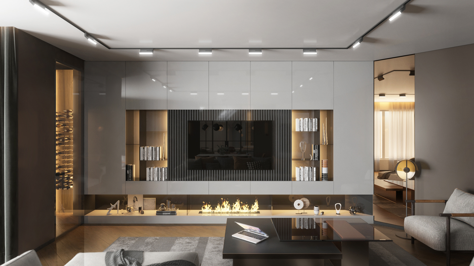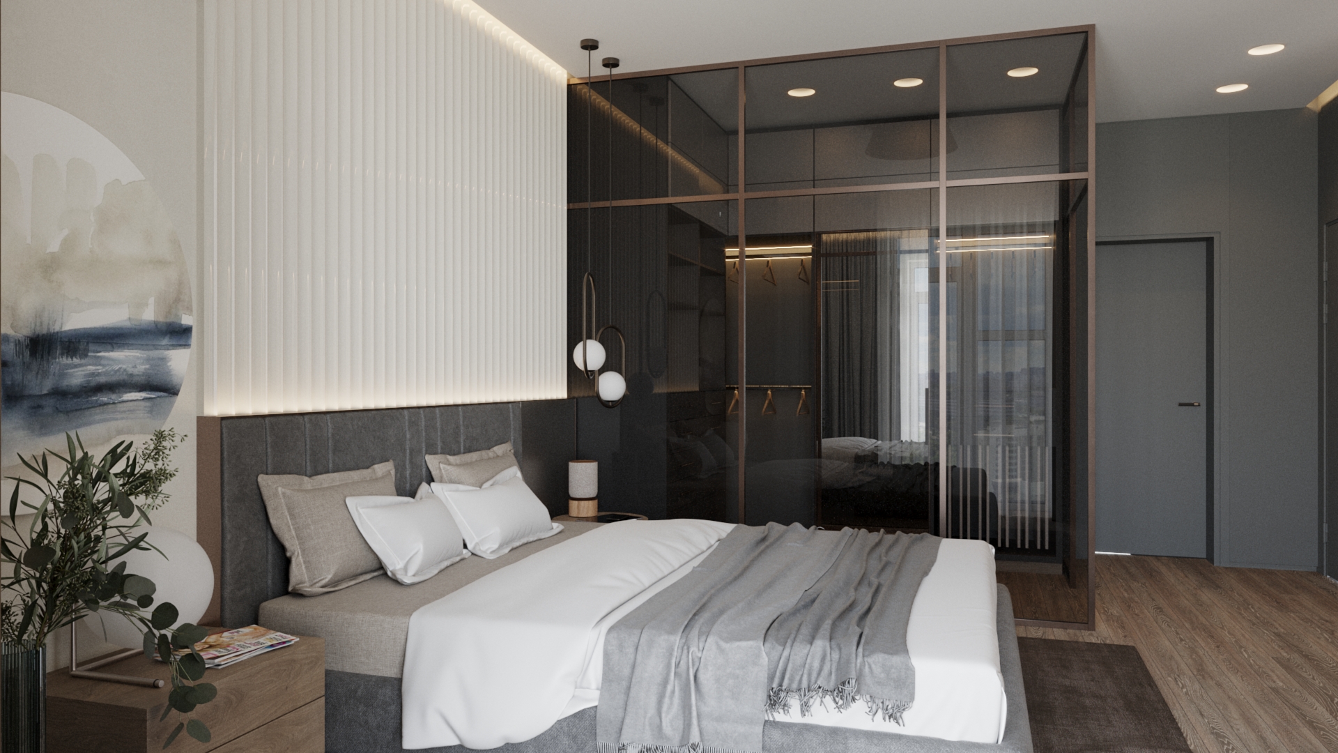 A built-in wardrobe-bar in the living room area behind a glass door offers a unique mood while also visibly expanding the space. The kitchen’s ergonomic arrangement will make your life easier, and its design, which features gray and illuminated glass cabinets, reflects the space’s utility, attractiveness, and cleanliness.