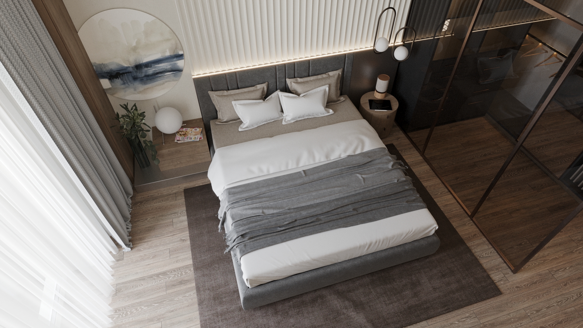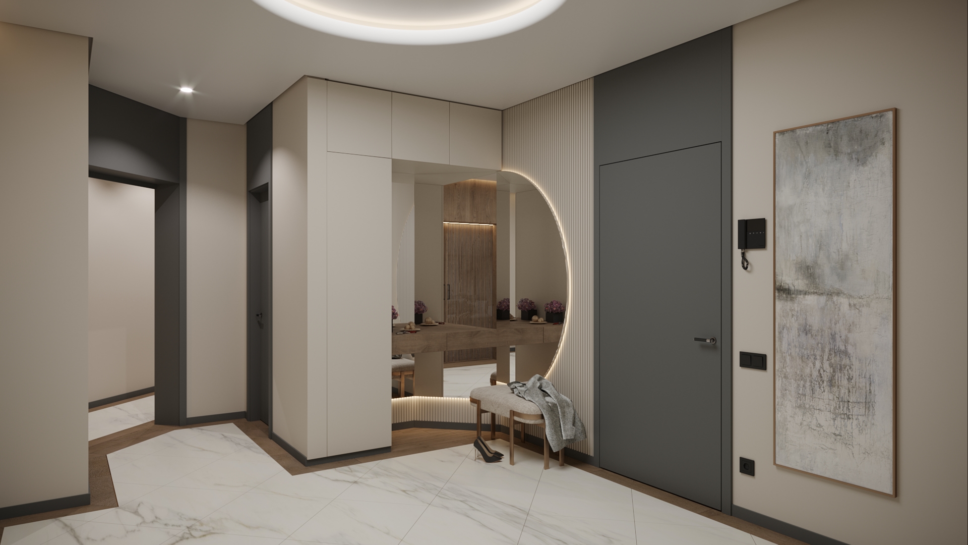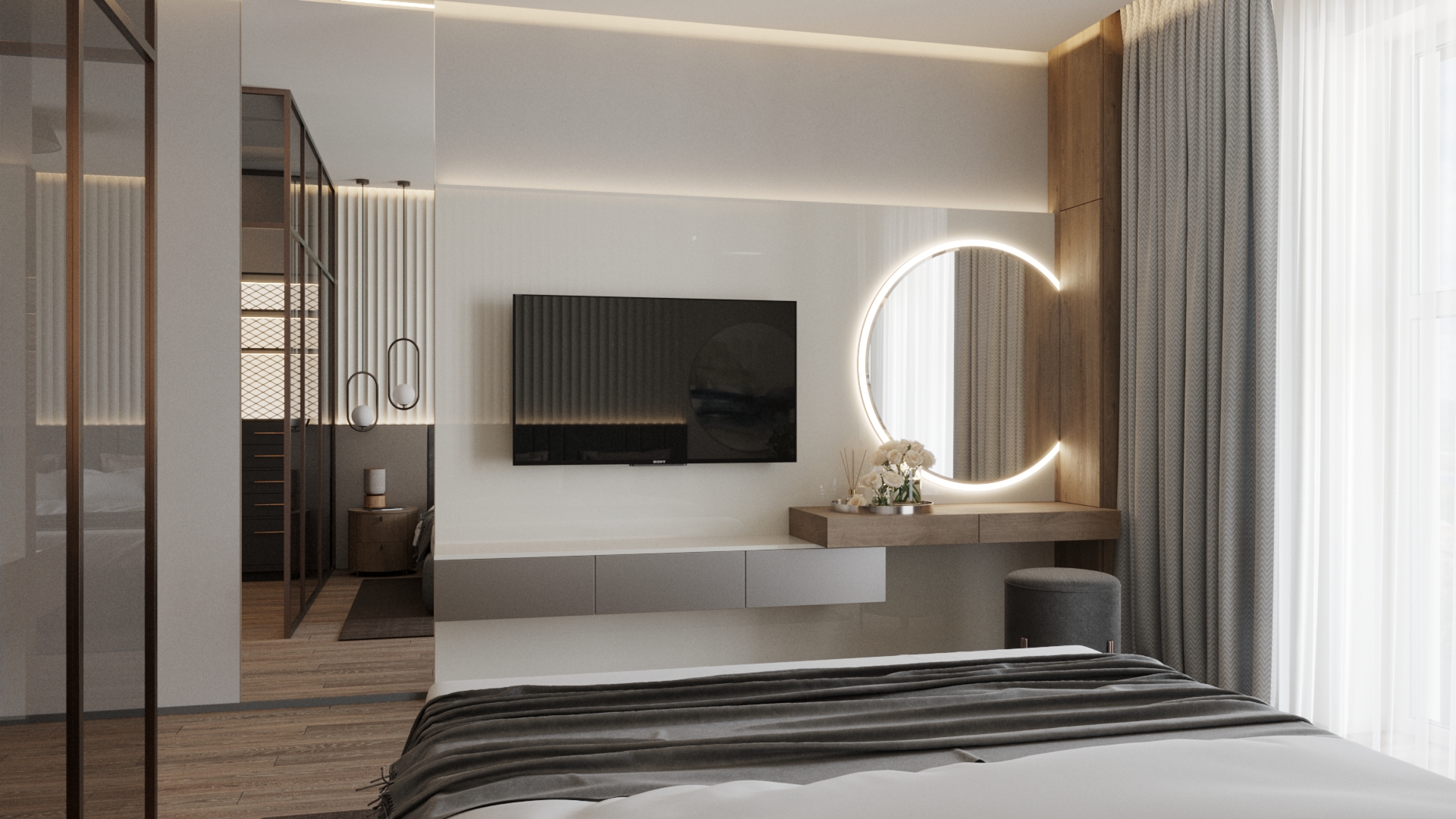 A built-in wardrobe-bar in the living room area behind a glass door offers a unique mood while also visibly expanding the space. The kitchen’s ergonomic arrangement will make your life easier, and its design, which features gray and illuminated glass cabinets, reflects the space’s utility, attractiveness, and cleanliness.