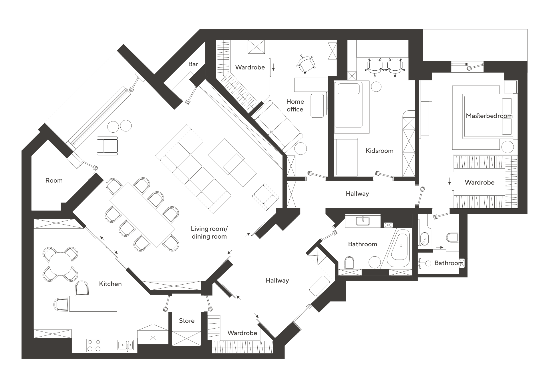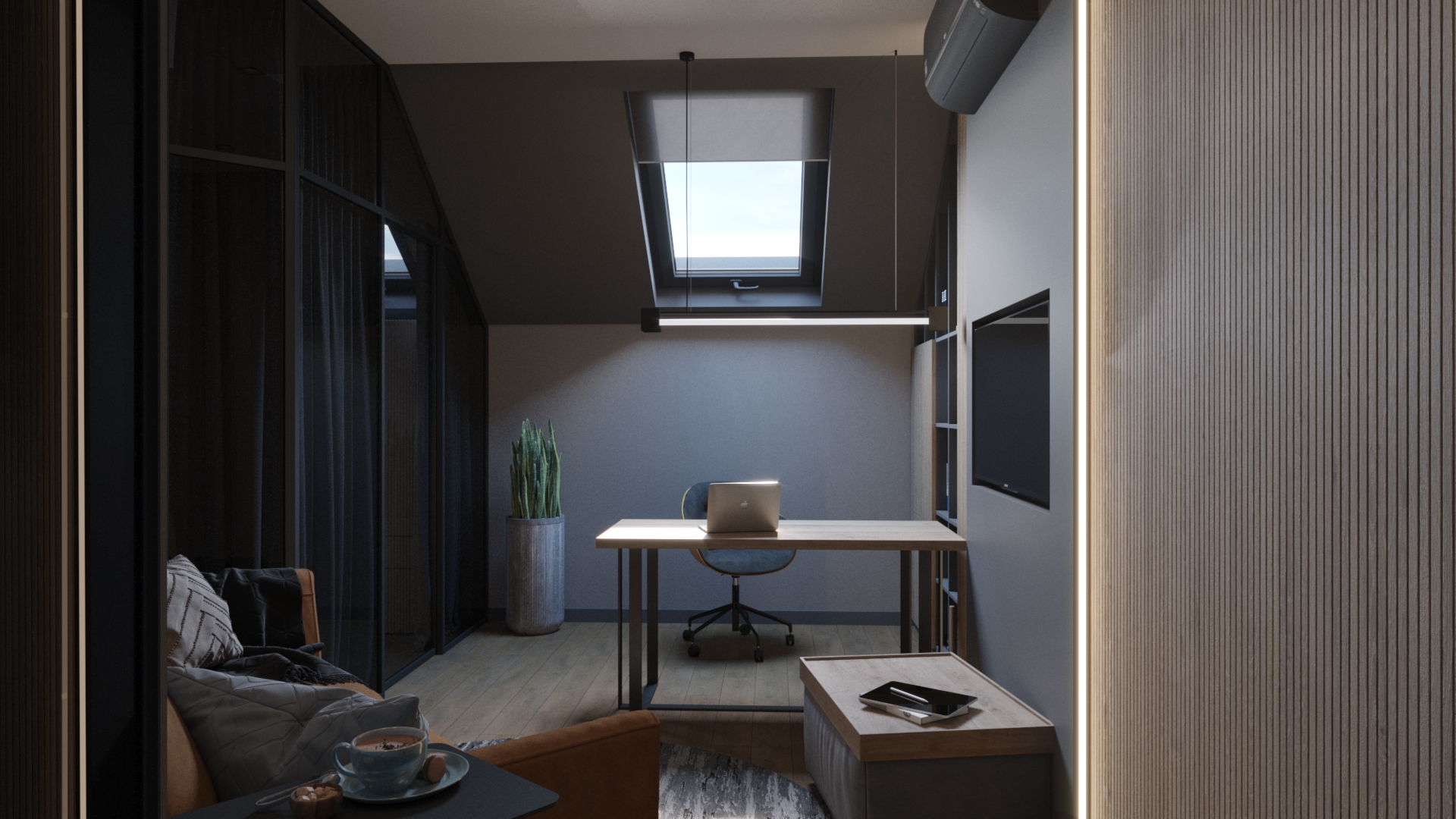 The apartment option also features a small men’s office with a skylight and an additional closet, in line with current trends in good married partnerships.