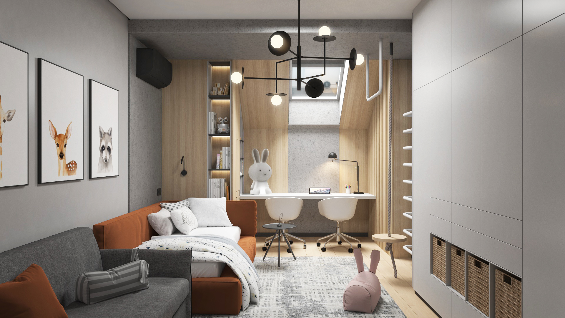 The children’s room is a distinct room with a skylight, in gender-neutral colors, and may be expanded from a baby’s demands to a schoolchild’s practical space.