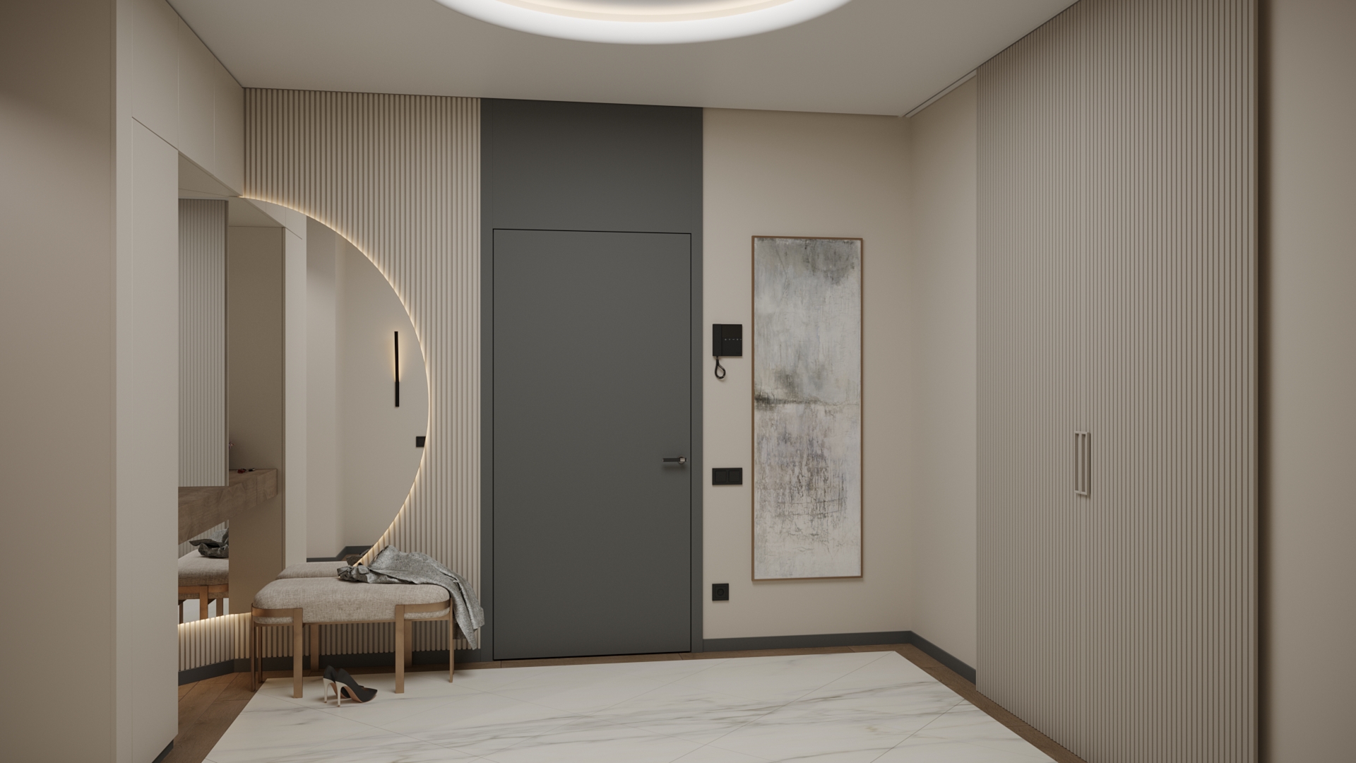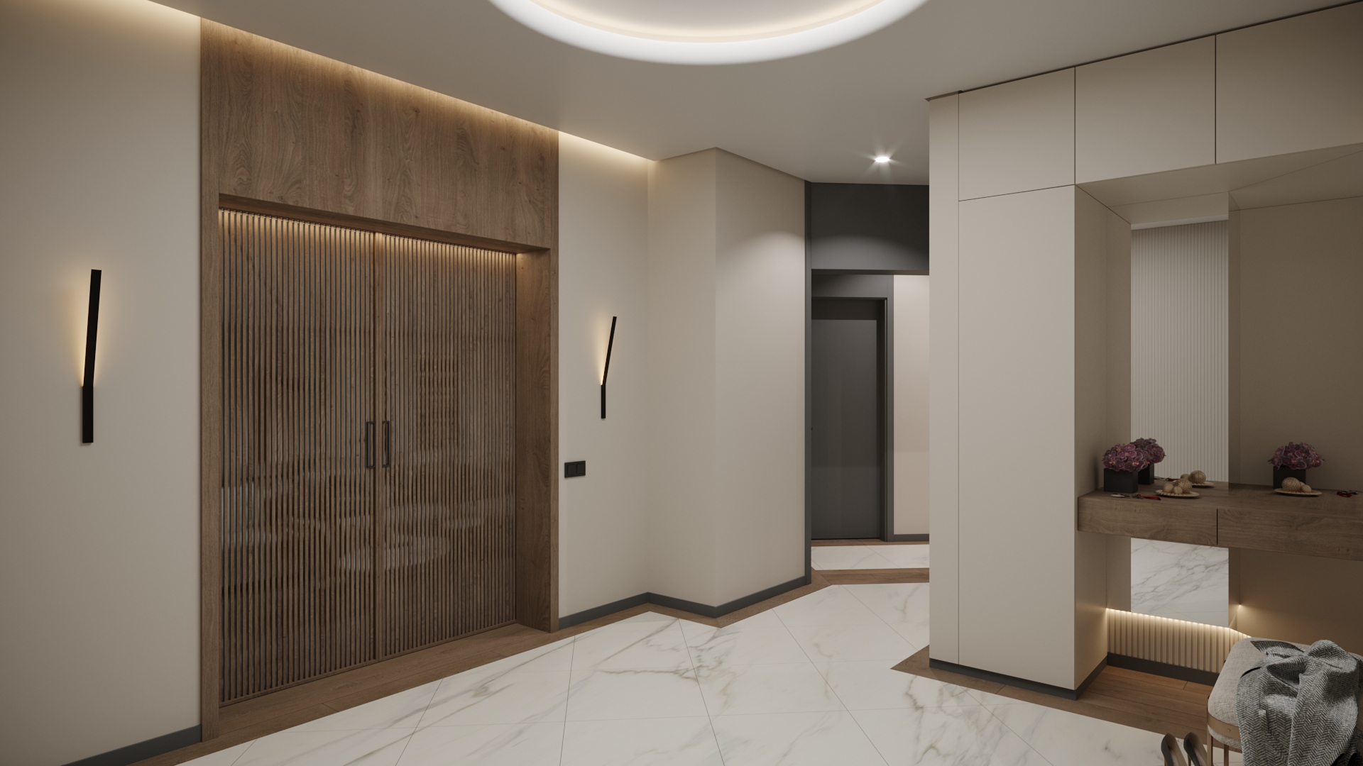 This apartment’s design focuses on living, relaxation, and future plans. The best choice for a young married couple: a spacious living-dining room with a TV area and a bio-fireplace, a convertible table, and a large sofa – all of this makes a flexible space with family comfort for two and a pleasant rest for a large group.