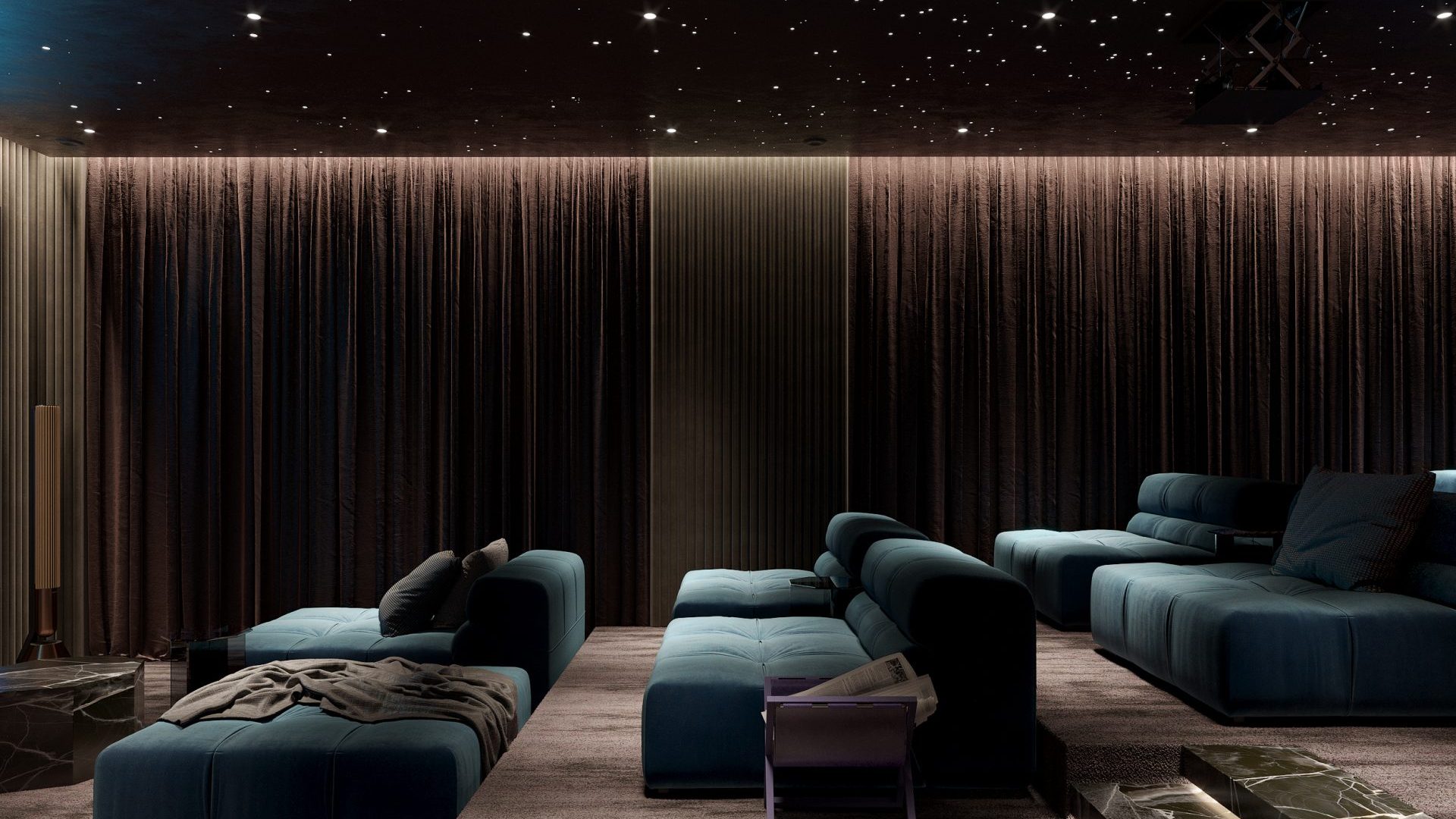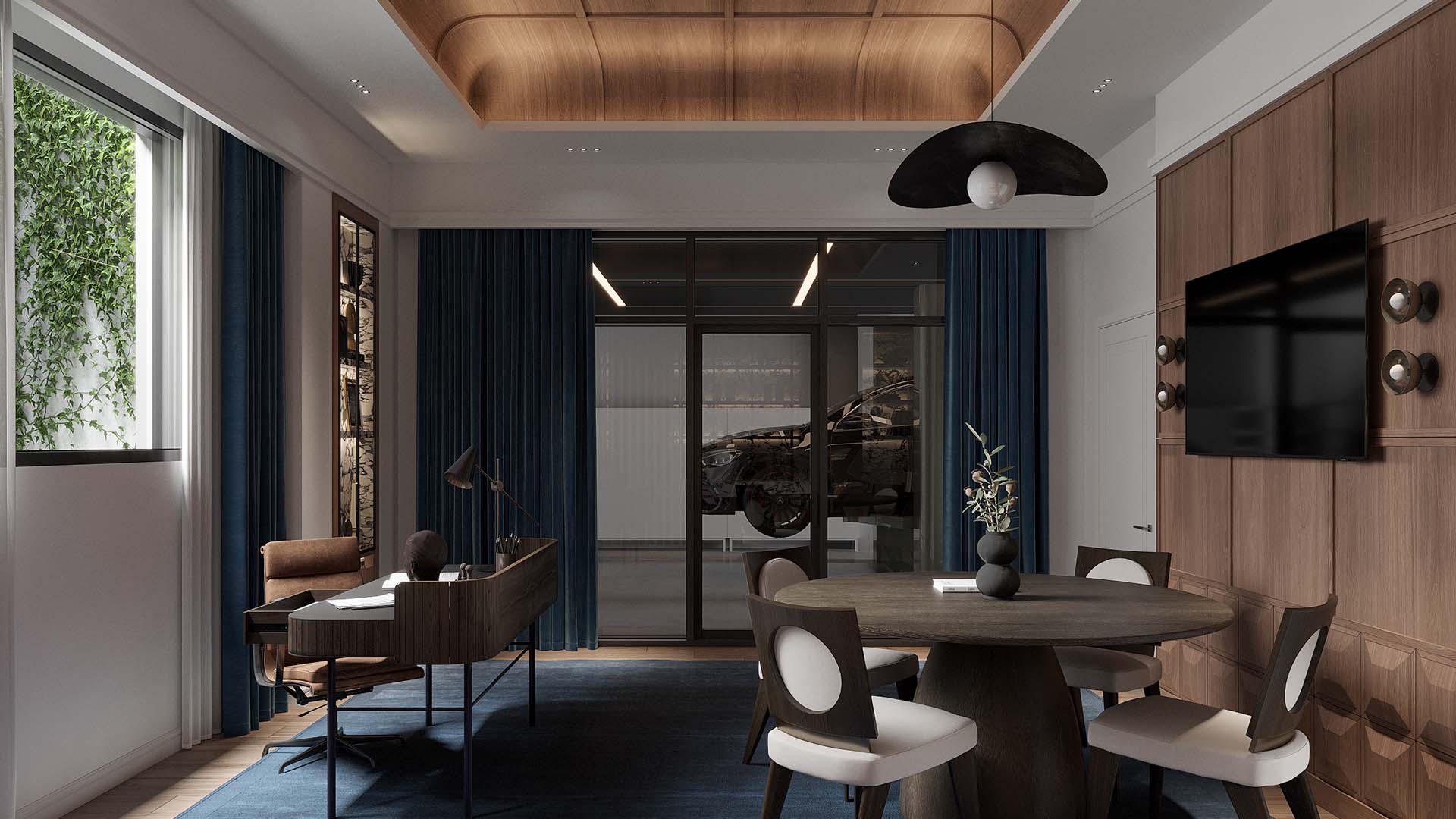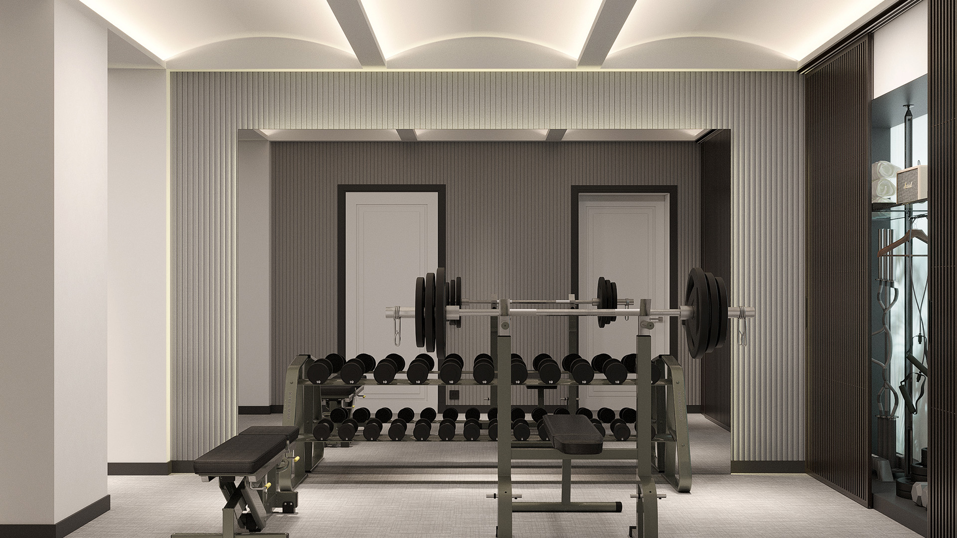 The ground level is a recreation and men’s section, including a large office, a gym, a cinema room, and a garage.