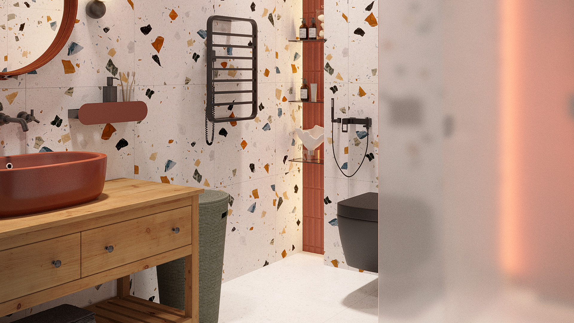 The main kitchen is connected to the technical kitchen; the entrances are located on the same level as the kitchen’s facade and are “hidden” by furnishings doors. The symmetry of the functional zone layout displays a wealth of decor and art objects.