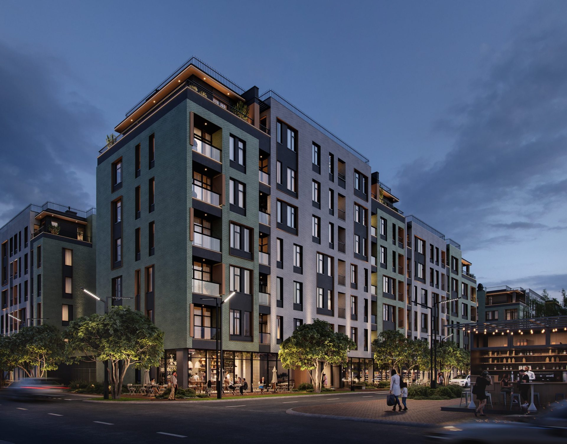Здания комплекса – 6- и 7-этажные. Верхние этажи разновысоких секций в своей основе имеют западающие вовнутрь фасады с террасами. Вдоль основного бульвара на первых этажах расположены сплошные ряды коммерческих помещений, которые также западают вовнутрь от общего фасада, добавляя лёгкость и воздушность всему комплексу. Под зданием находится подземный паркинг для жильцов комплекса.