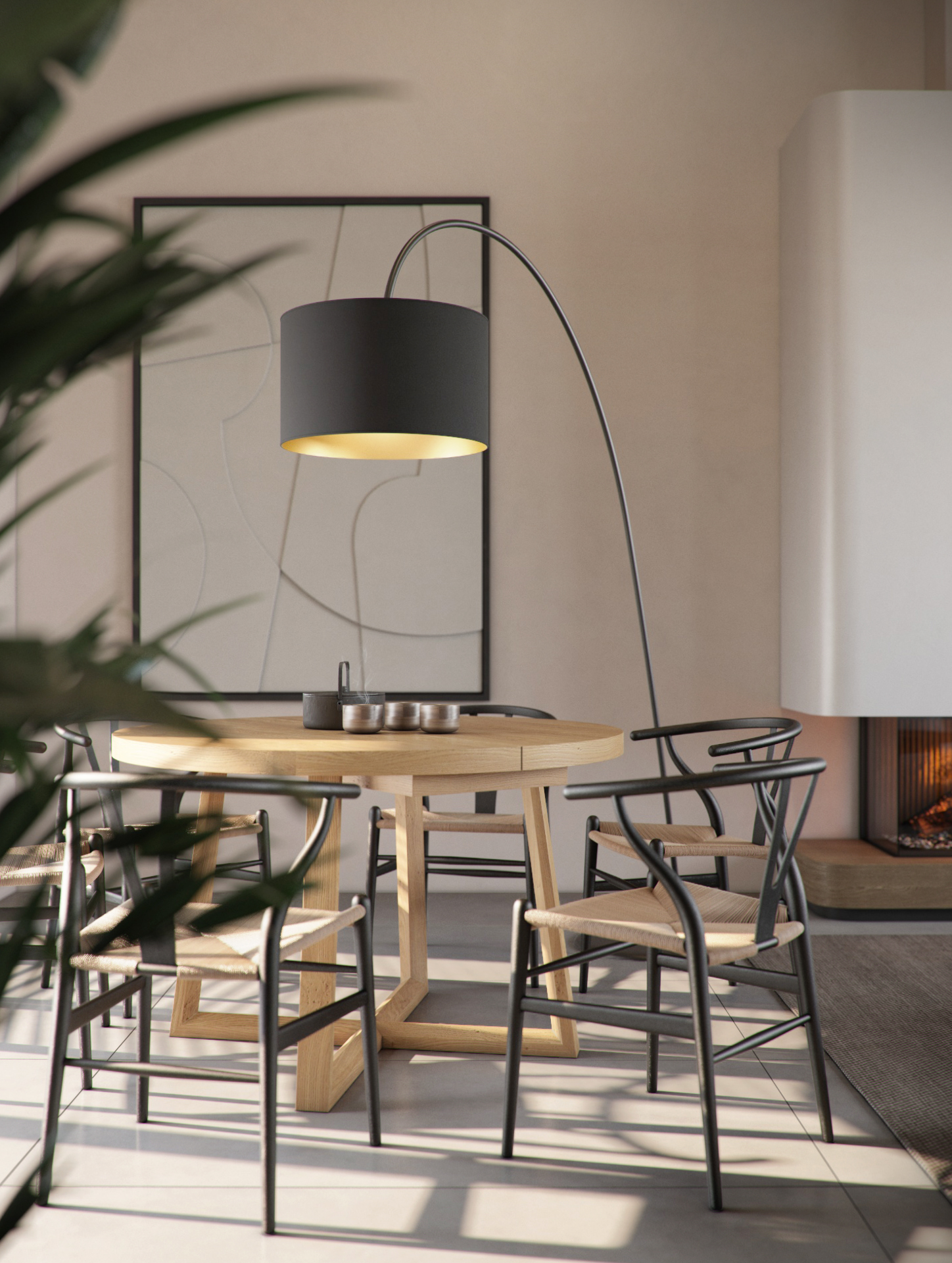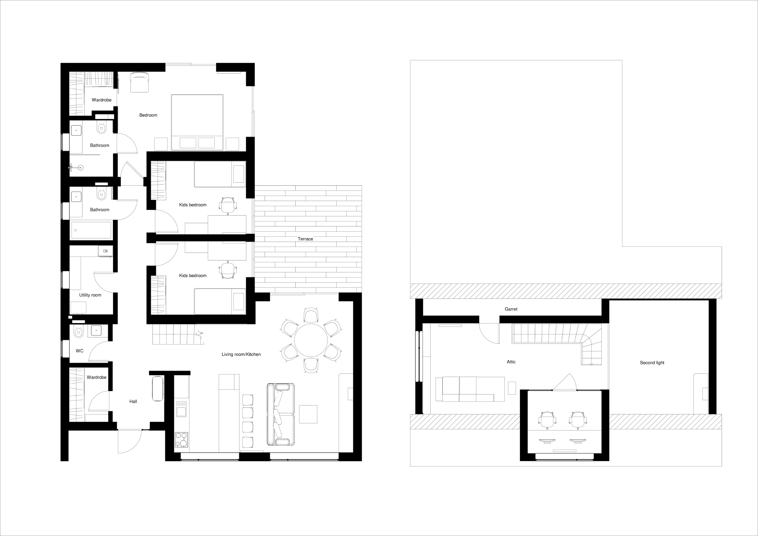 Дотримуючись принципів ергономіки, ми подбали, щоб кожна зона була максимально функціональною: облаштували простору двоколірну кухню з їдальнею, розмістили антресоль під покрівлею, де розташовано кабінет з робочим простором для двох.