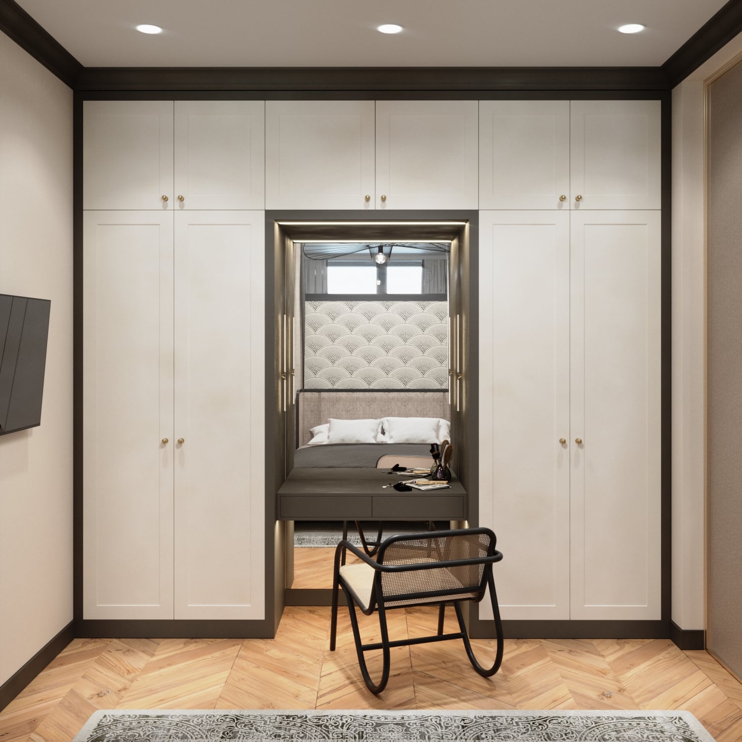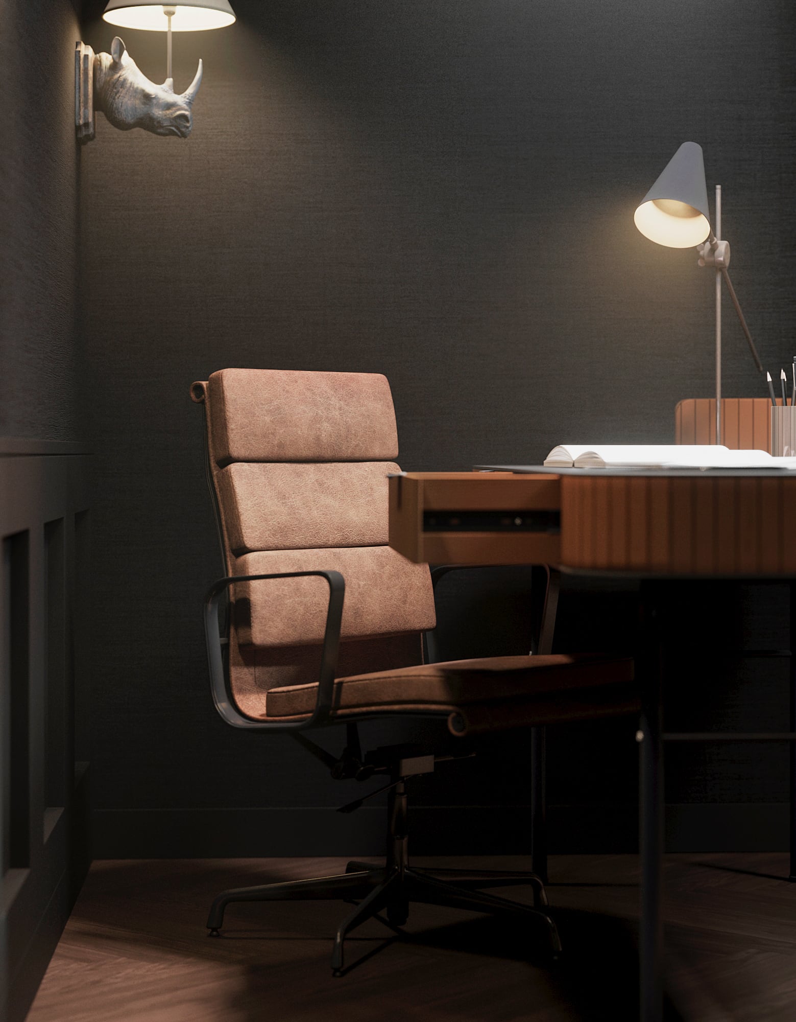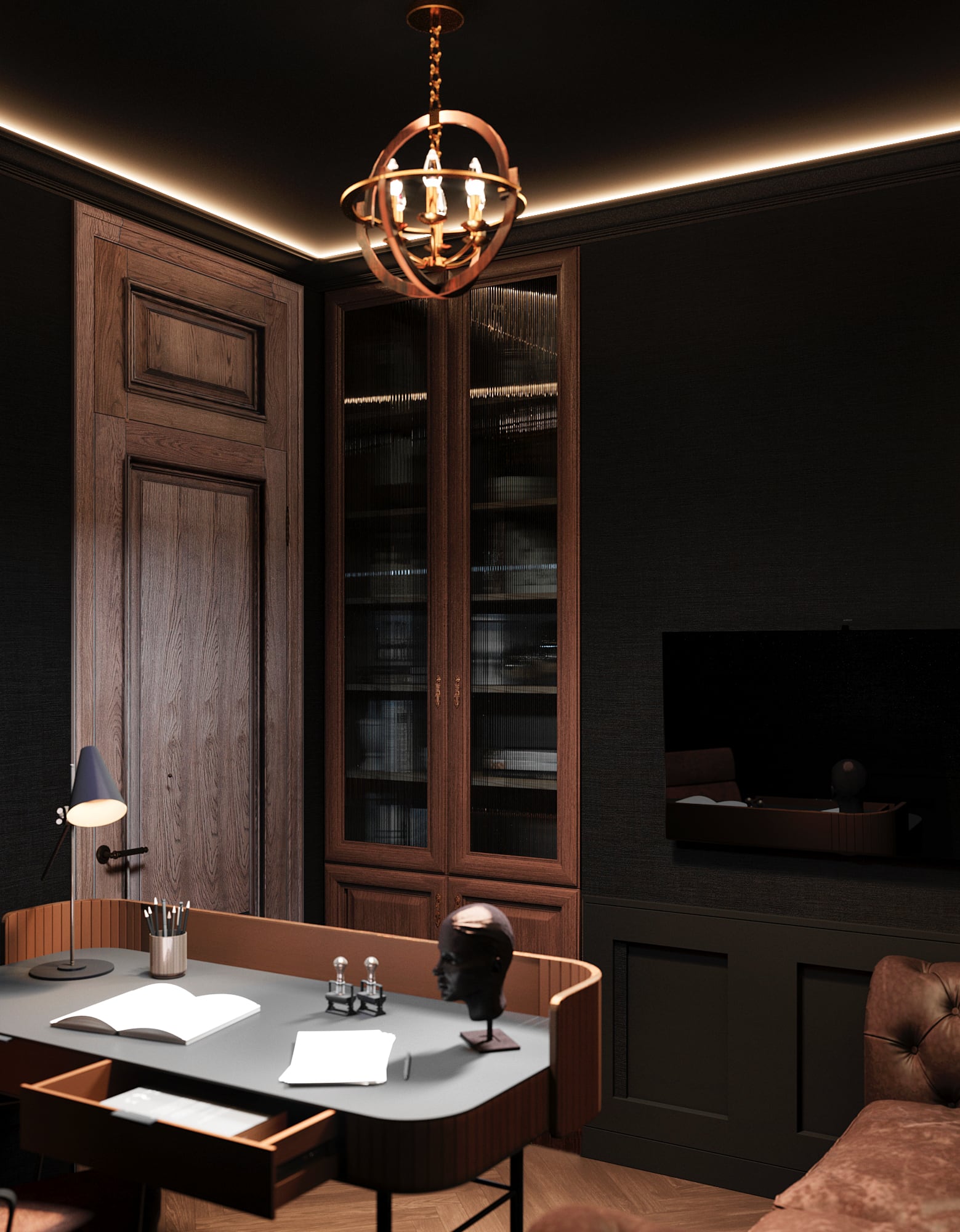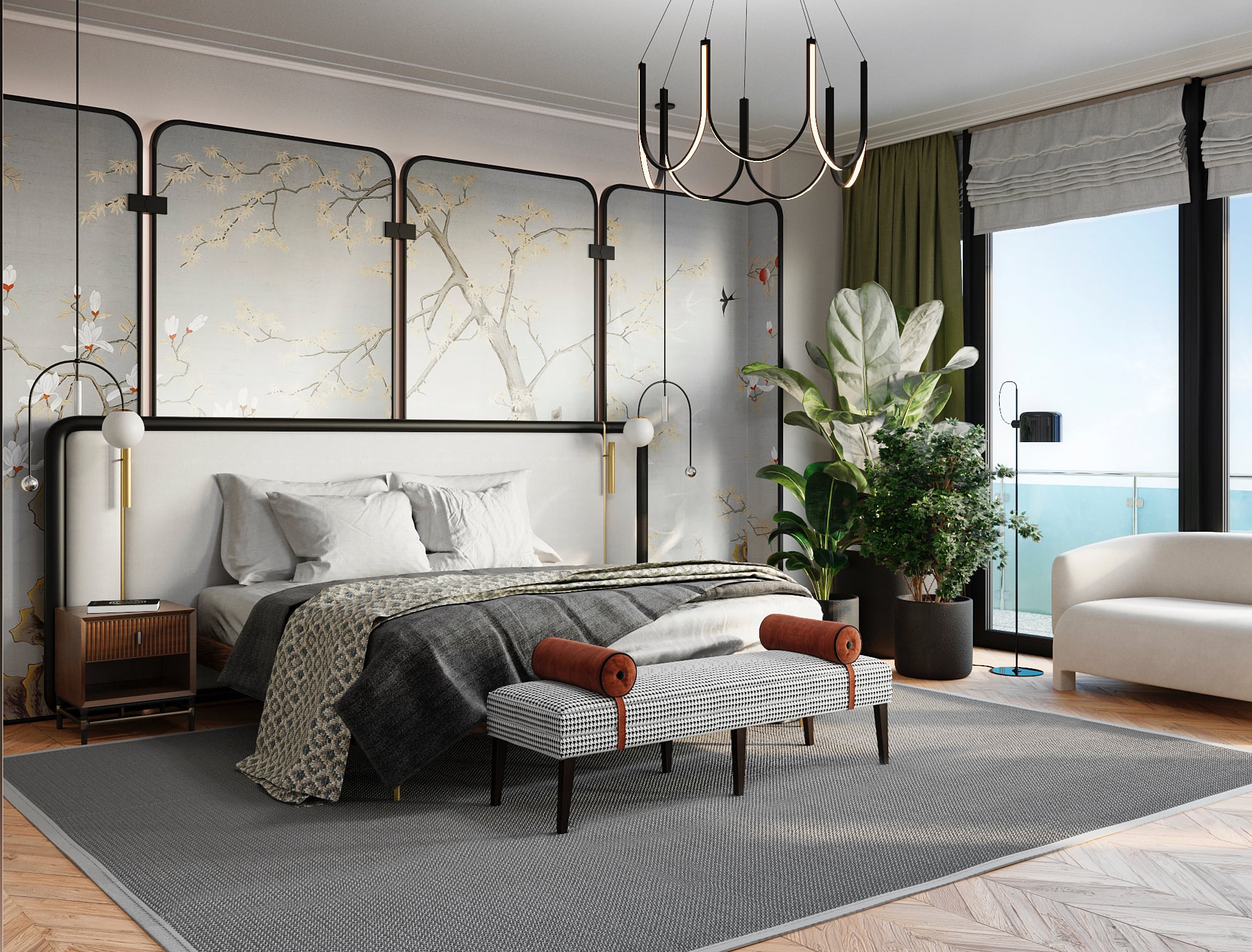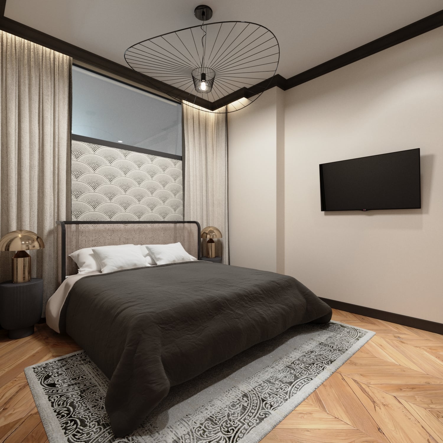 Інтер’єр розроблений в еклектичному стилі з комбінацією мід сенчері модерн, японських деталей, класичними елементами та нотами шинуазрі. В ньому використані текстури дерева, глини натуральних тканин.