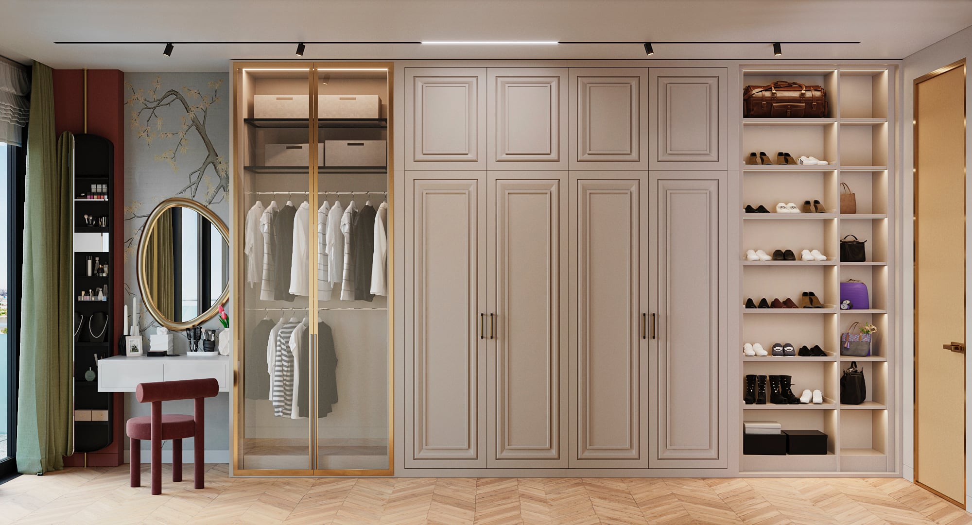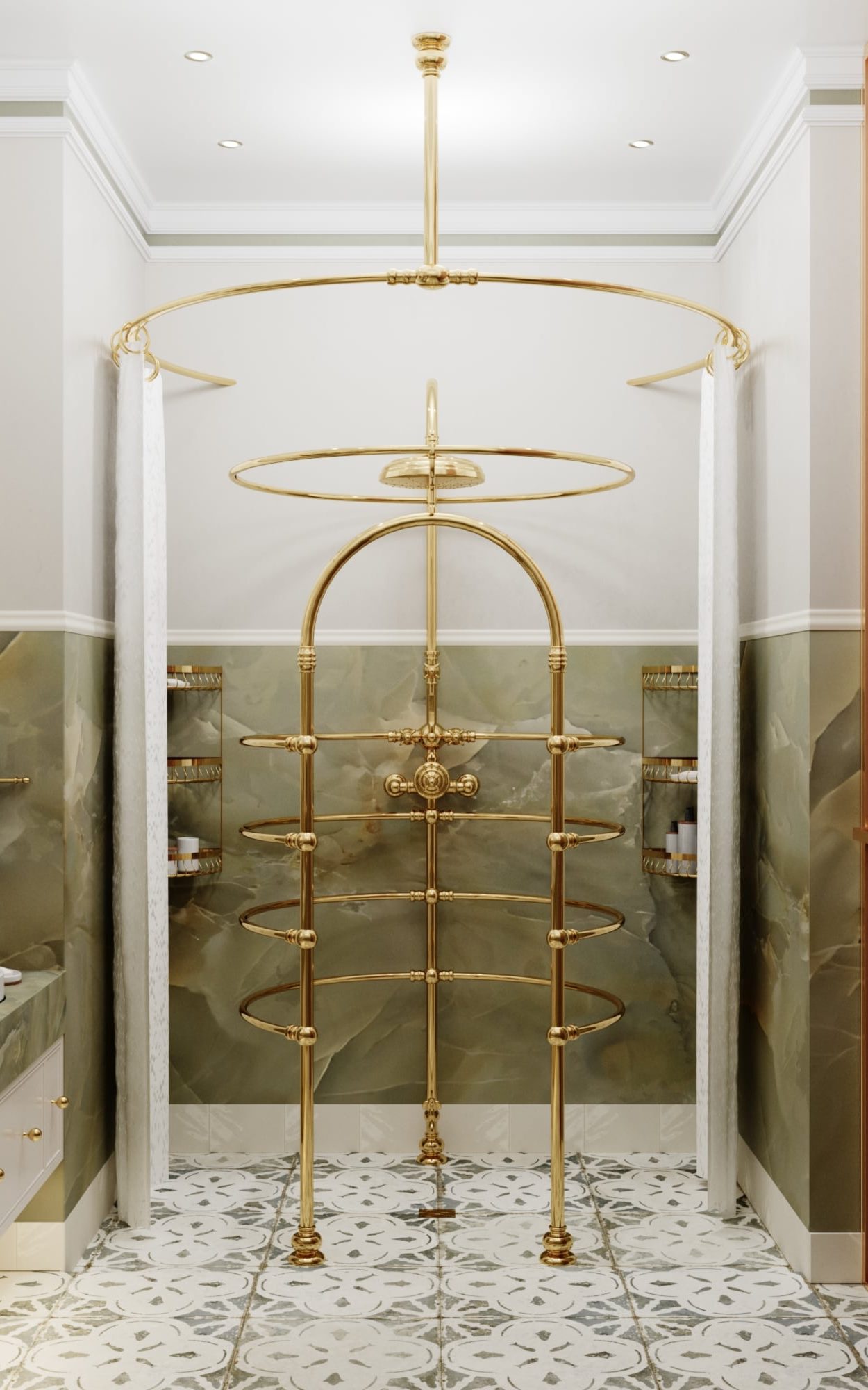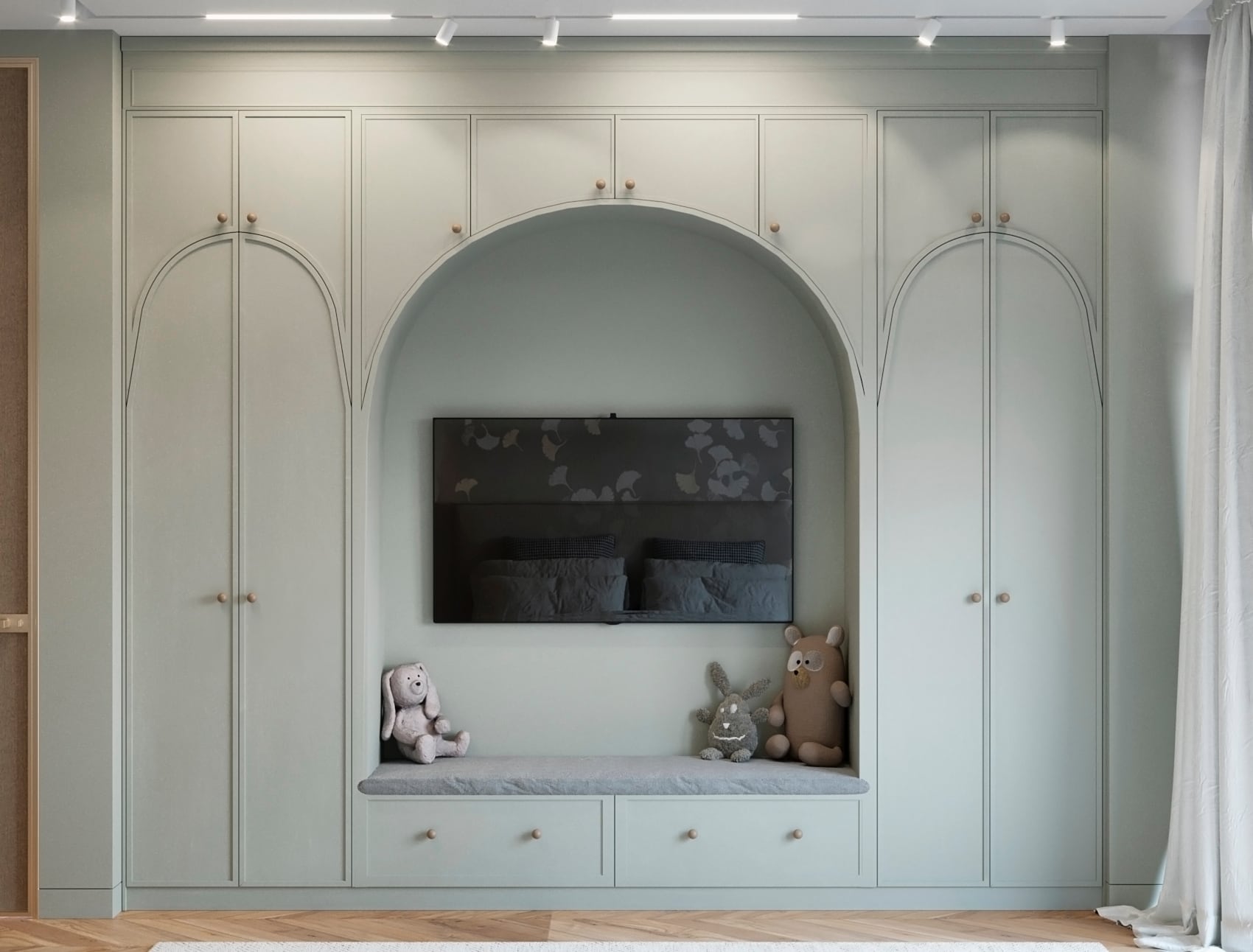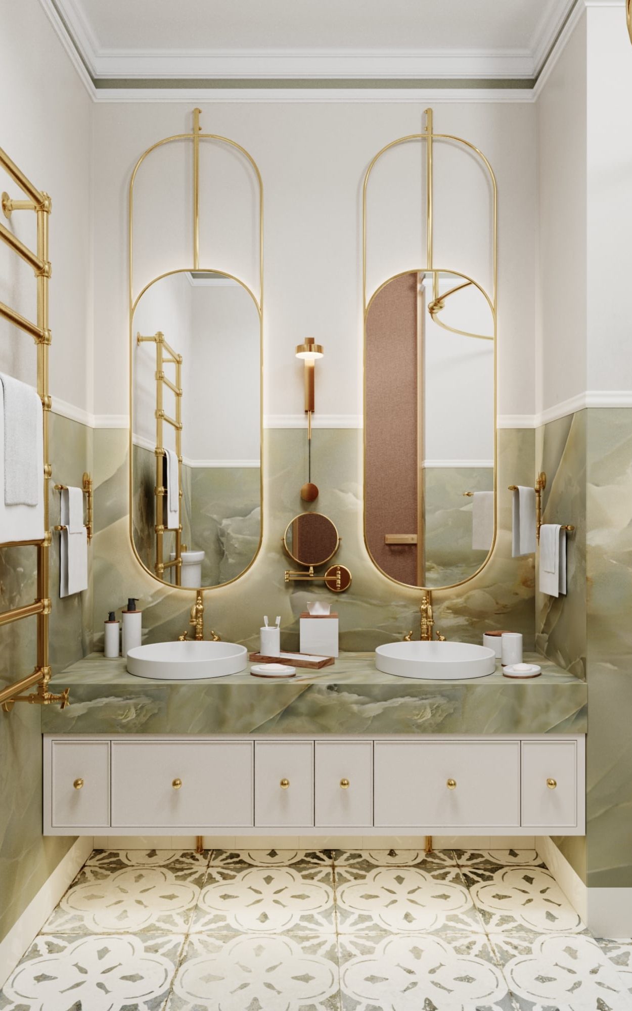 Основним кольором в оформленні став зелений оливковий. Його доповнили: білий, світло-бежевий, пісочний, відтінок світлого дерева, латунь, чорні акценти.