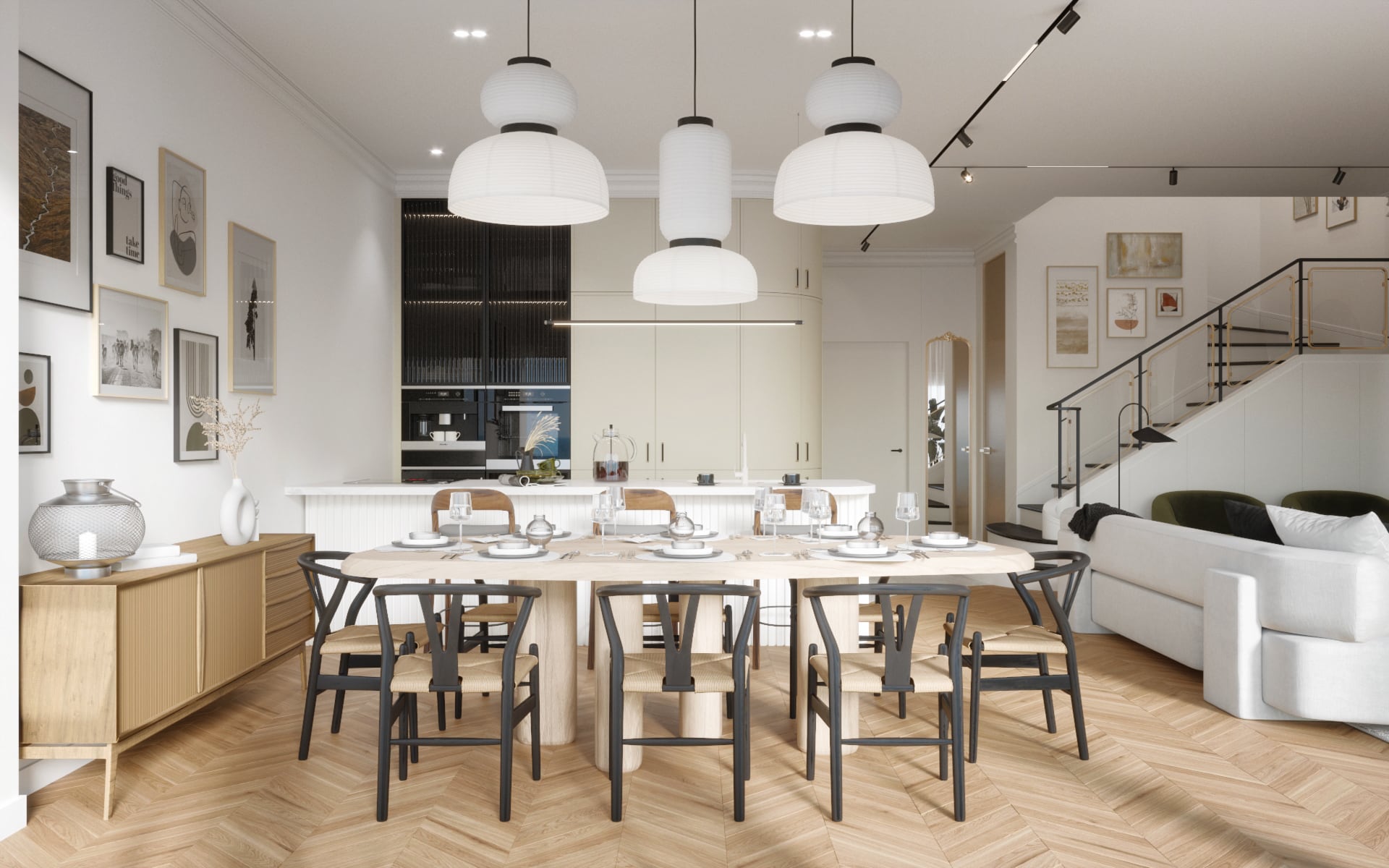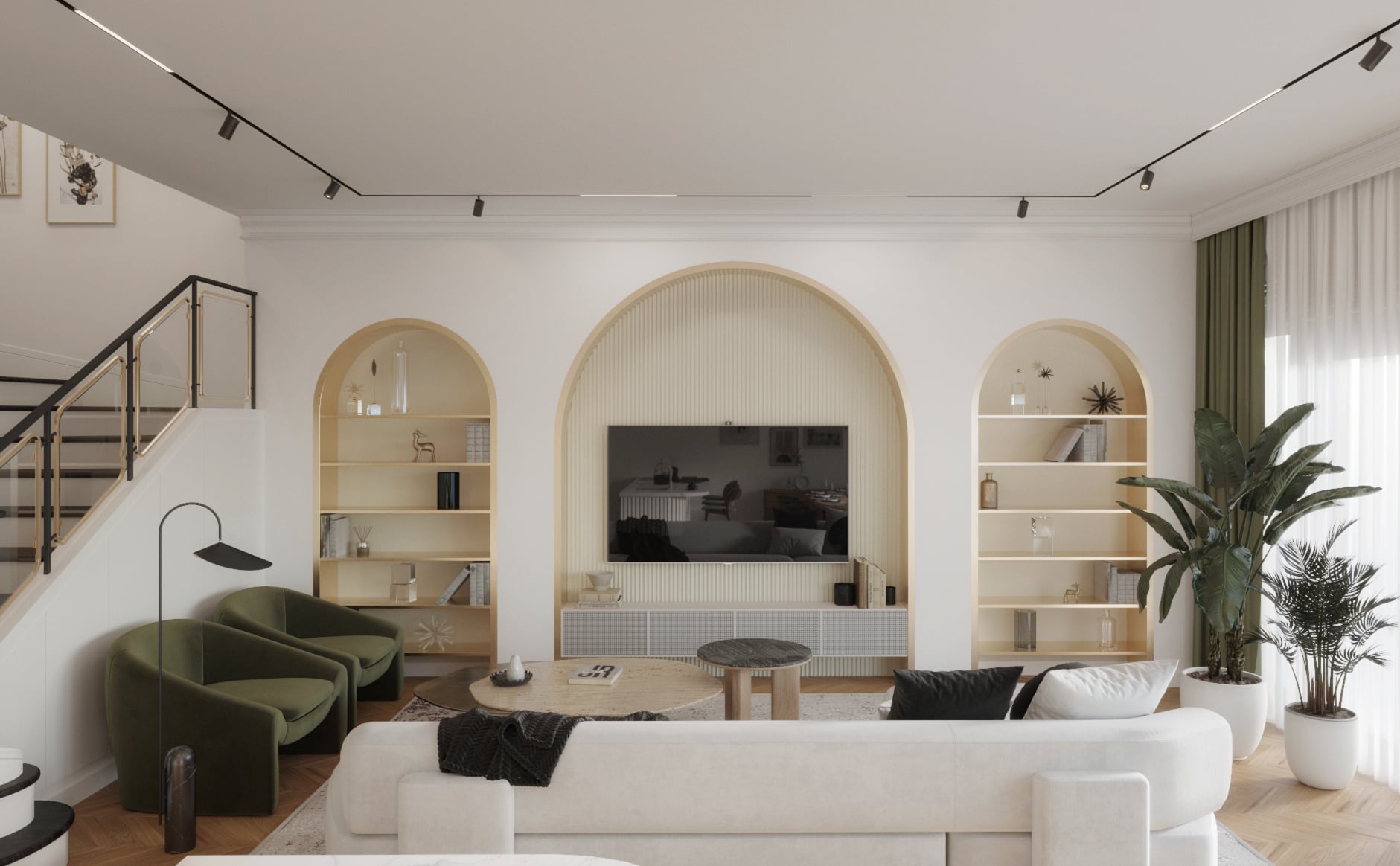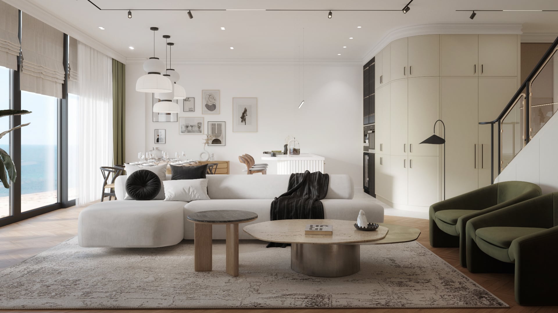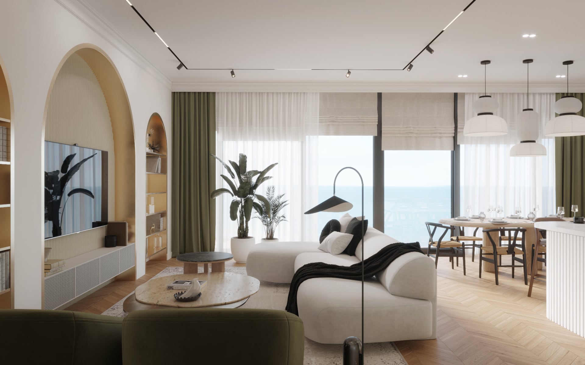 Дворівневий пентхаус на березі Каспійського моря для молодої сім’ї. Власники – харизматична пара естетів, колекціонерів мистецтва та вінтажних предметів інтер’єру.