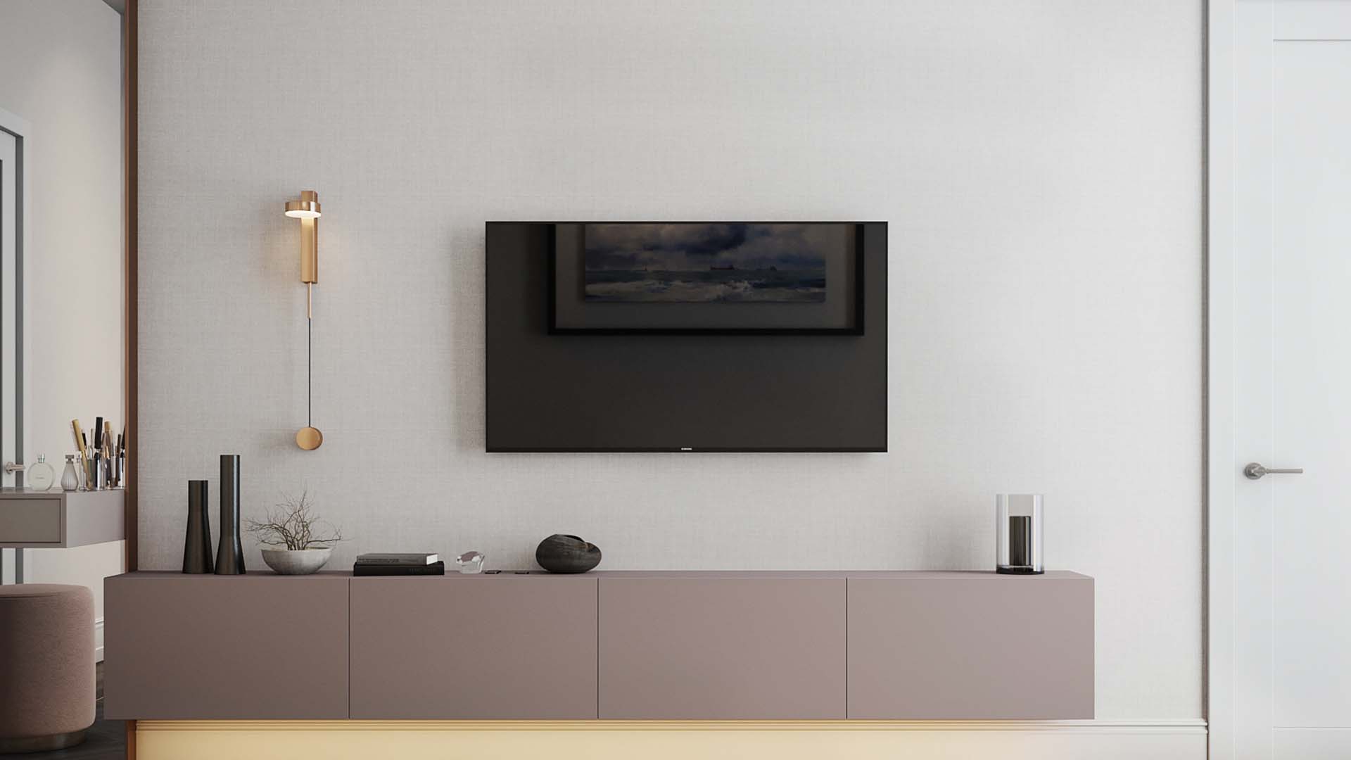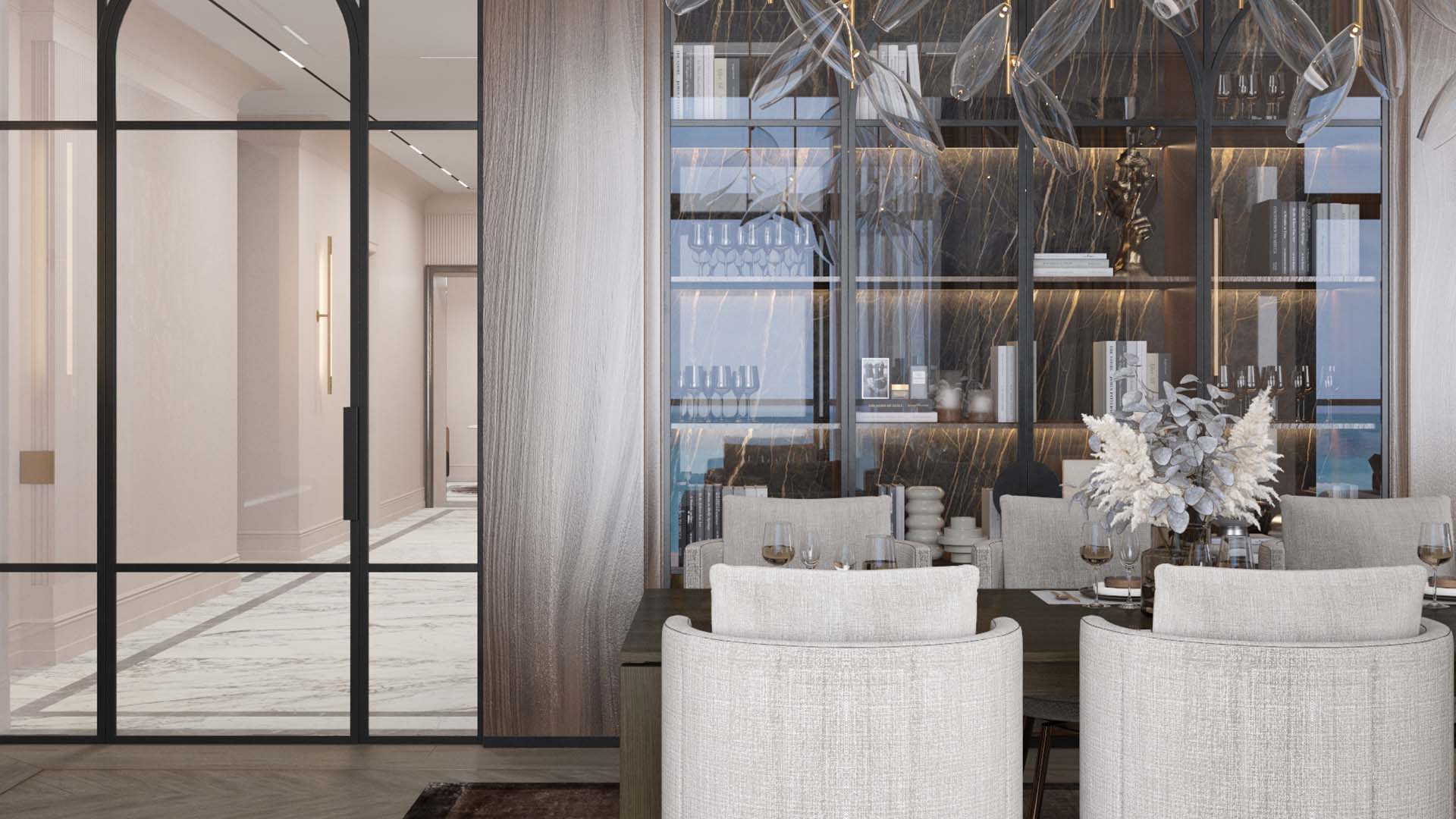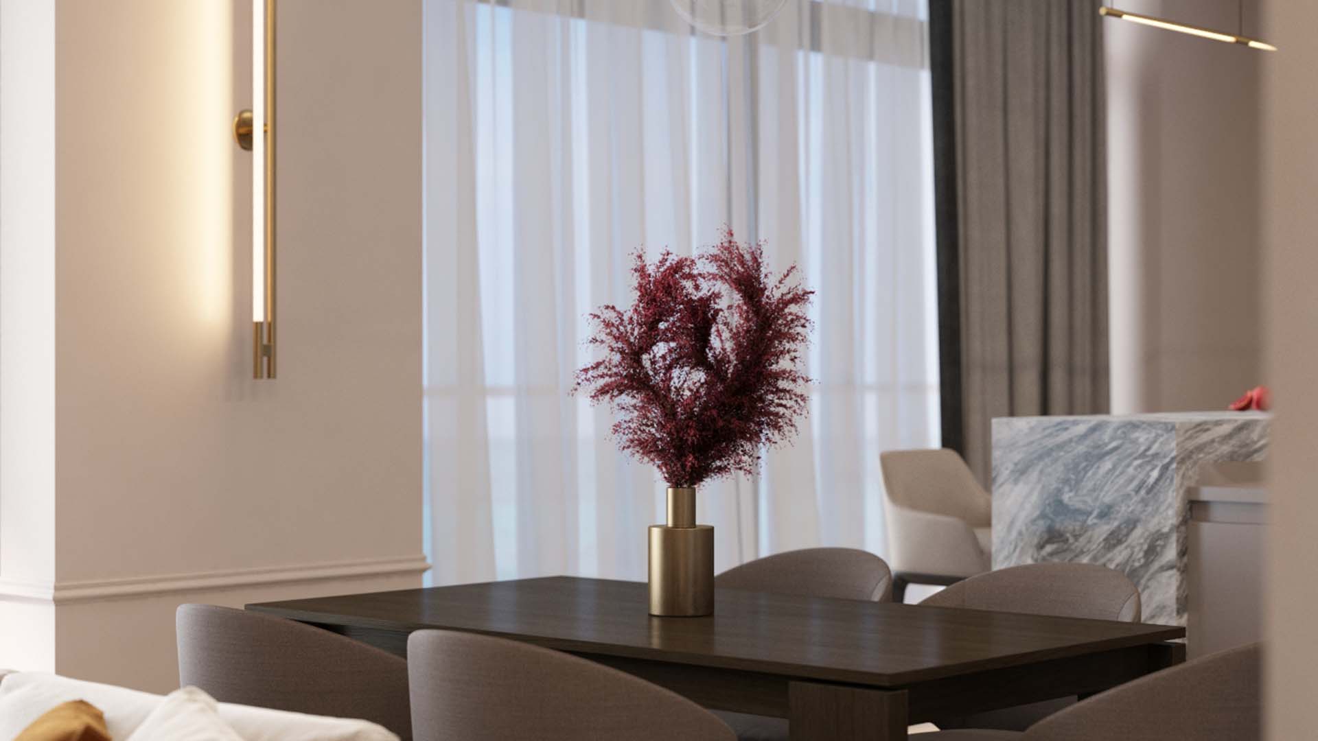 Інтер’єр пентхаусу мінімалістичний: пастельні тони і темне дерево в покритті підлоги і оббивці меблів створюють контраст, який підкреслює розкіш і вишуканість приміщення. Яскраві акценти тут в елементах декору: картинах, люстрі, дереві з червоними деталями тощо. До речі, постери в загальній кольоровій гамі інтер’єру чудово передають спокійний настрій простору.
