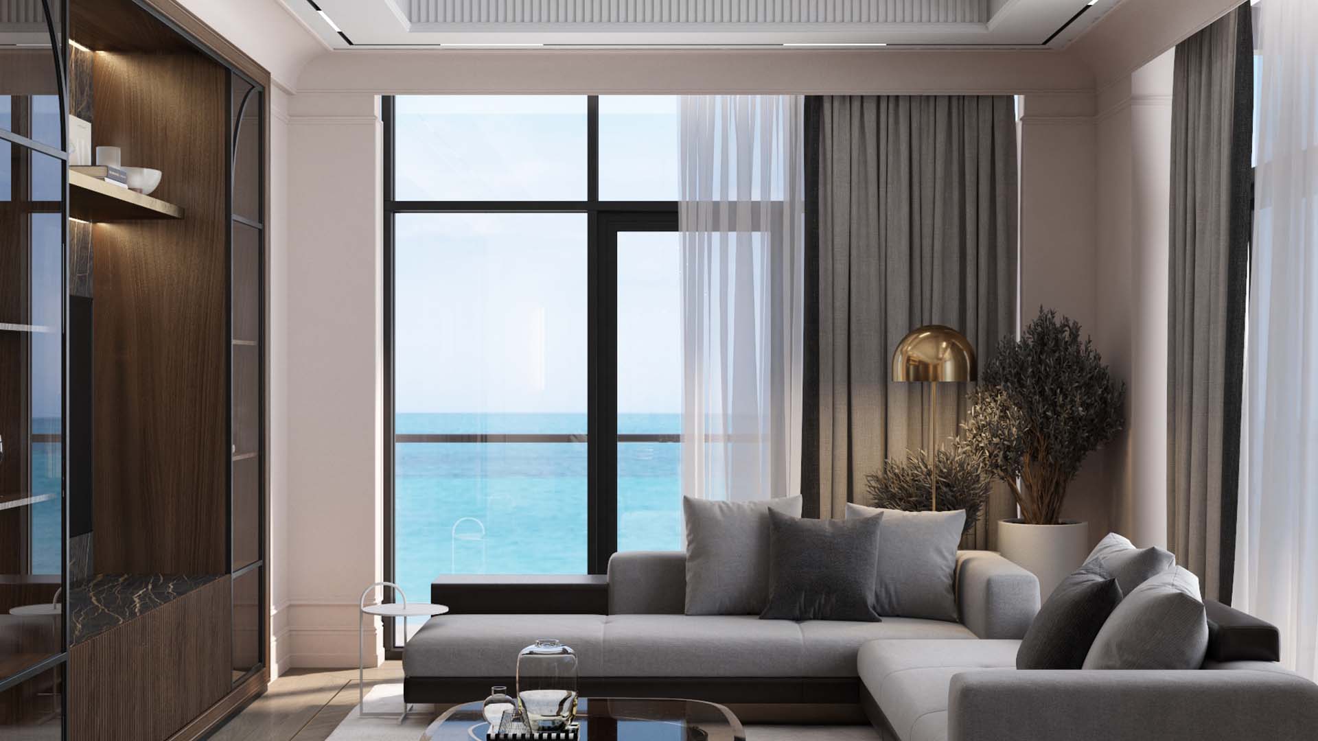 Зона денного проведення дозвілля включає кухню з барною стійкою, невелику столову зону і лаунж з ТБ. Звідси можна одразу вийти на простору терасу і насолодитися видом на море. З панорамних вікон, якими оснащені велика їдальня та вітальня, також відкривається вид на море. У вітальні панує особлива атмосфера: яскраве сонячне світло, що заповнює кімнату, робить її теплою та затишною. Комбінація локального освітлення у вигляді люстри та ламп забезпечує приплив світла, що підкреслює м’якість загального образу.