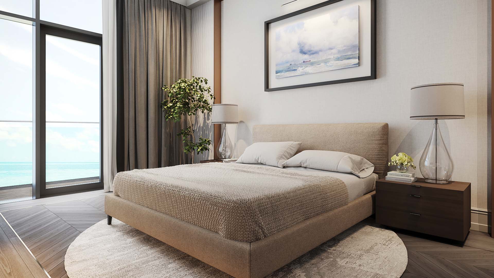 Майстер-зона з видовими вікнами включає простору спальню, гардеробну, багатофункціональну кімнату для занять пілатесом, робочий кабінет, а також зону відпочинку. Пентхаус має три дитячі спальні, зокрема для молодших дітей із власними санвузлами зі входами з коридору, та спальню старшого сина з гардеробом та санвузлом зі входом із спальні.